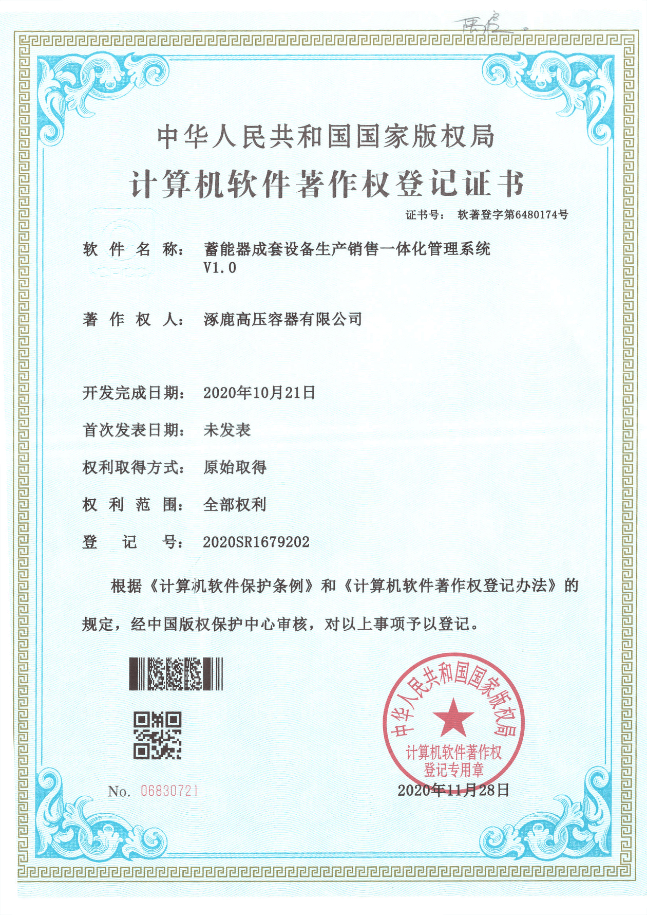 蓄能器成套設備生產銷售一體化管理系統軟著證書