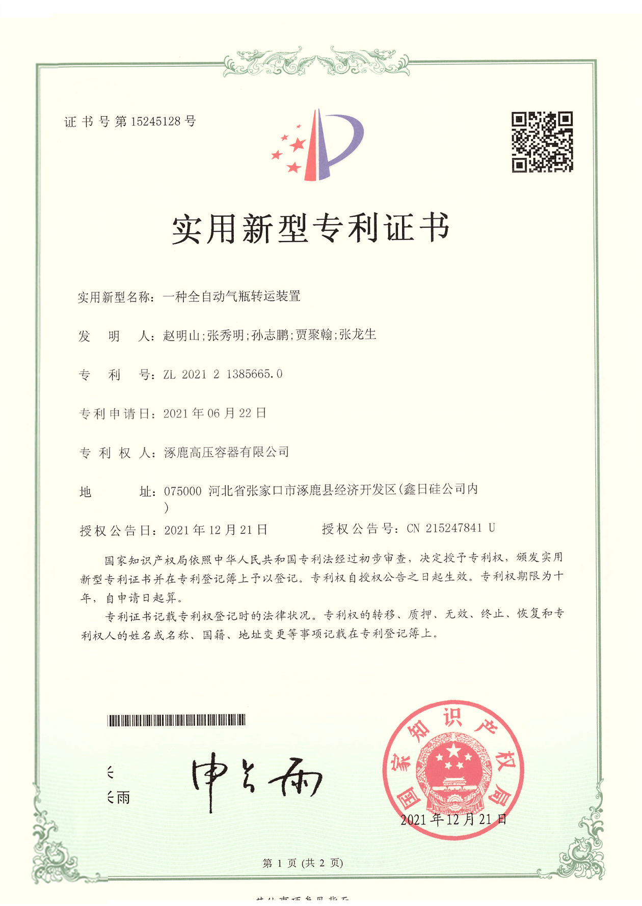 蓄能器殼體水壓測試裝置實用新型專利證書