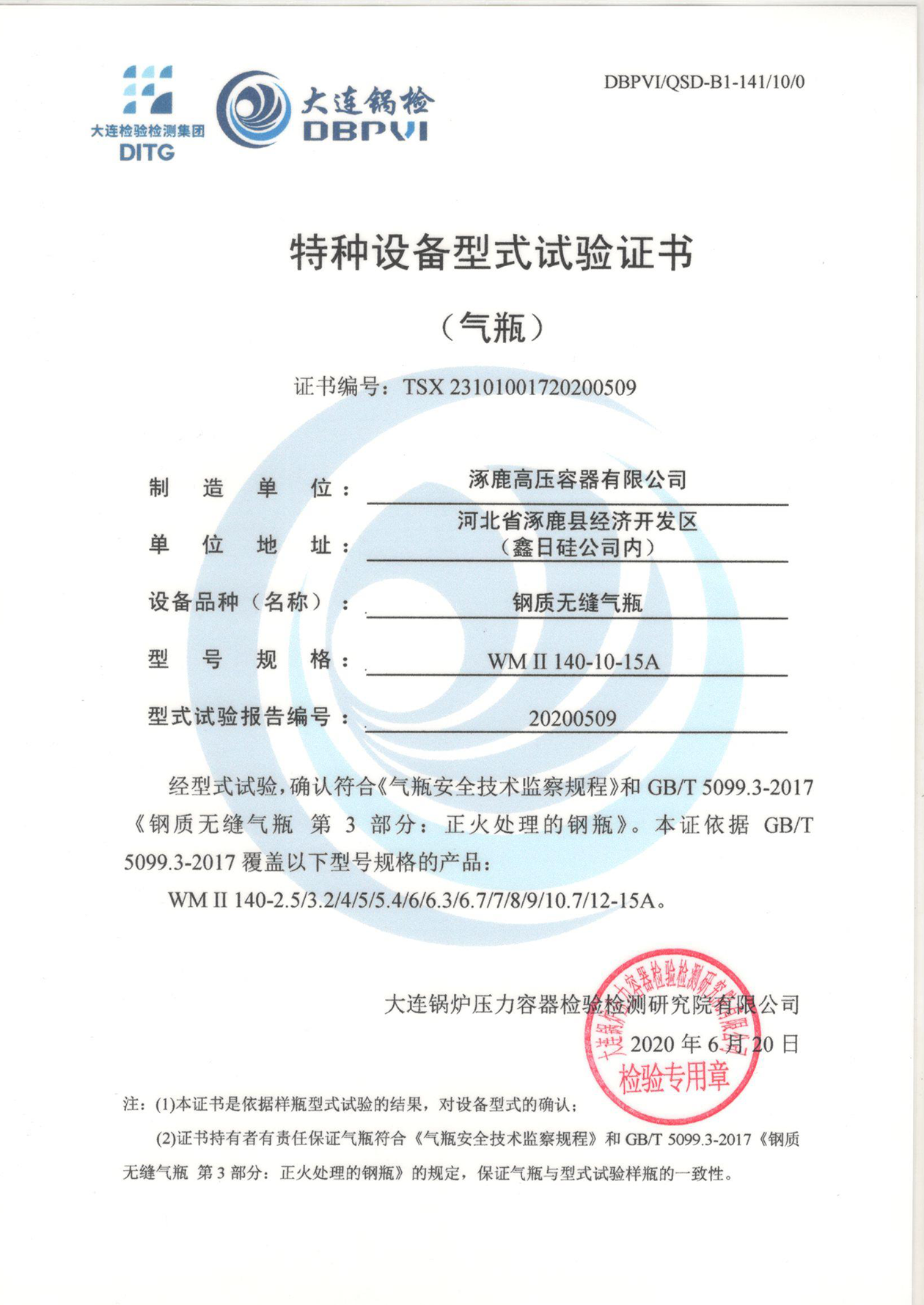 特種設(shè)備形式試驗(yàn)證書(鋼制無(wú)縫氣瓶)WMⅡ140-10-15A