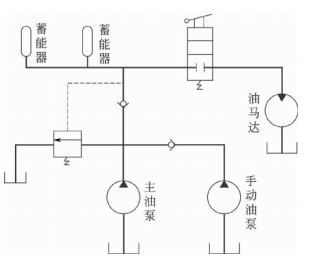 圖為柴油機的油馬達啟動系統,在該系統中設置有蓄能器。啟動時,扳動二位二通手動換向閥,蓄能器供油驅動馬達去帶動柴油機啟動。柴油機啟動后松開手動換向閥,截止通向馬達的回路,油泵向蓄能器充油,以備再用。圖中手動油泵是在蓄能器漏泄后補油用。