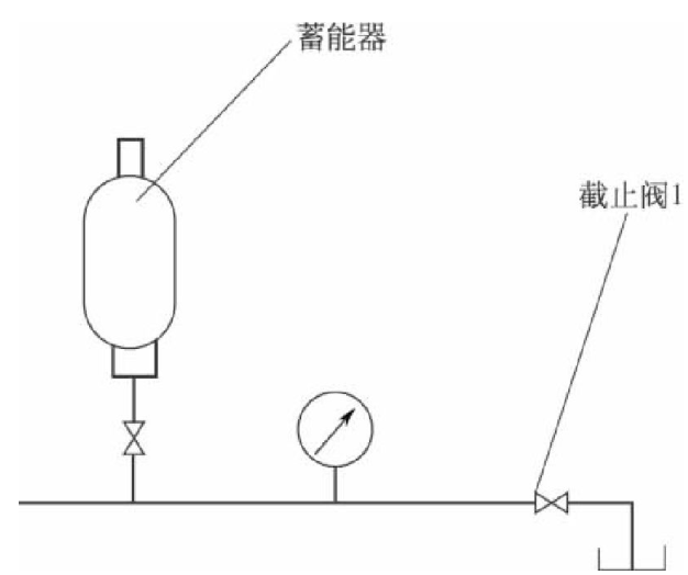 ①檢測(cè)時(shí),按照?qǐng)D所示的蓄能器壓力檢測(cè)回路連接,在蓄能器進(jìn)油口和油箱間設(shè)置截止閥1,并在截止閥1前安裝上壓力表,慢慢打開截止閥1,使壓力油流回油箱,觀察壓力表,壓力表指針先慢慢下降,達(dá)到某一壓力值后速降到0,指針移動(dòng)速度發(fā)生變化時(shí)的讀數(shù)(即壓力表值速降到0時(shí)的某一壓力值),就是充氣壓力。